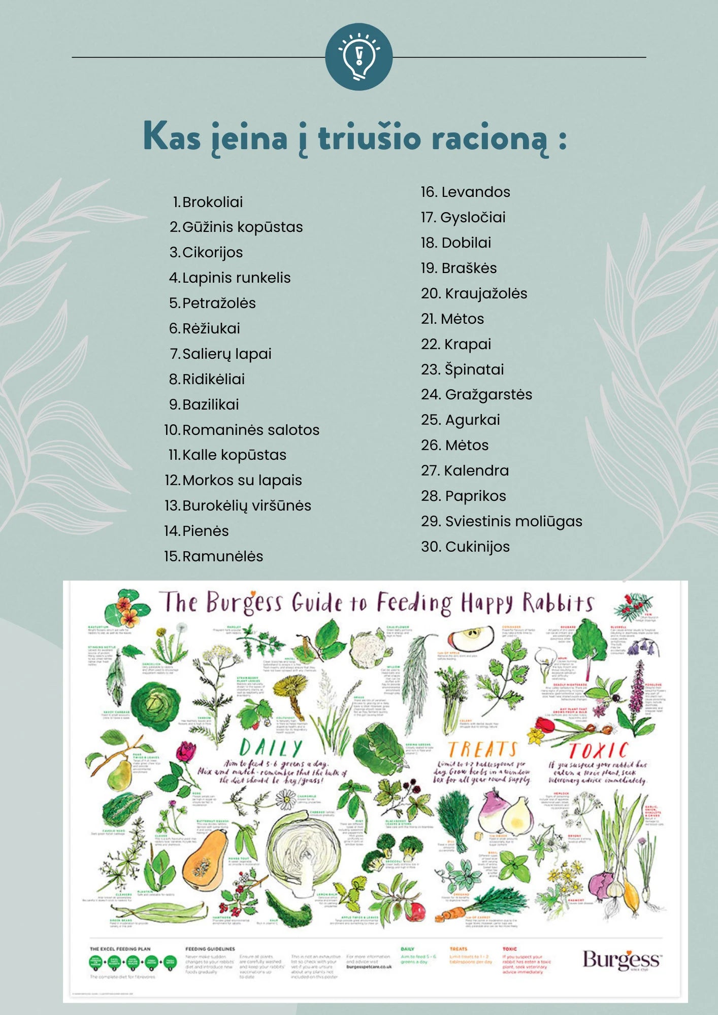 Ši 16 puslapių PDF knygutė – patikimas informacijos šaltinis visiems, kurie domisi triušių auginimu, dekoratyviniais triušiais ar ieško patarimų, kaip tinkamai prižiūrėti naminius triušius. Joje rasite atsakymus į dažniausiai užduodamus klausimus, su kuriais susiduriama auginant triušiukus.