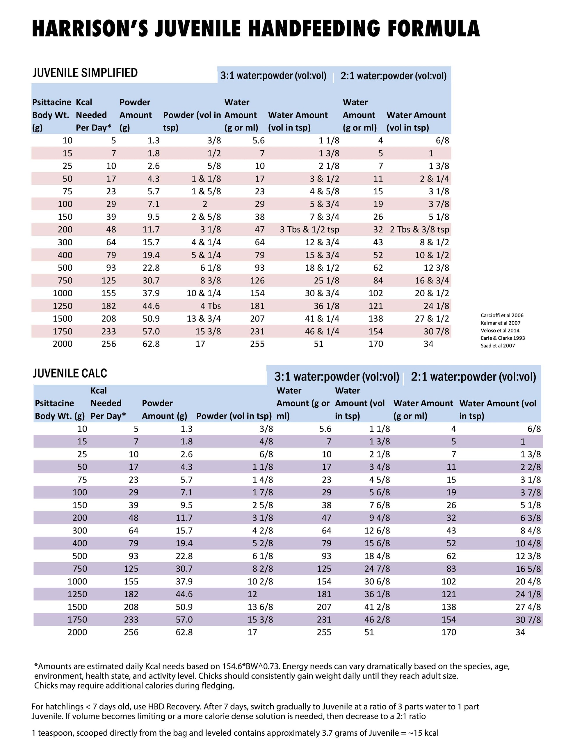 Maitinimas: tinkama speciali rankinio maitinimo technika užtikrina saugumą ir išvengia inhaliacijos ar pneumonijos. Formulė tinkama nuo 1 dienos pionams, Afrikos pilkosioms papūgoms, amazonėms, kakadu, aratingoms, aroms; nuo 7 dienos – kitoms paukščių rūšims; nuo 21 dienos – nimfoms.